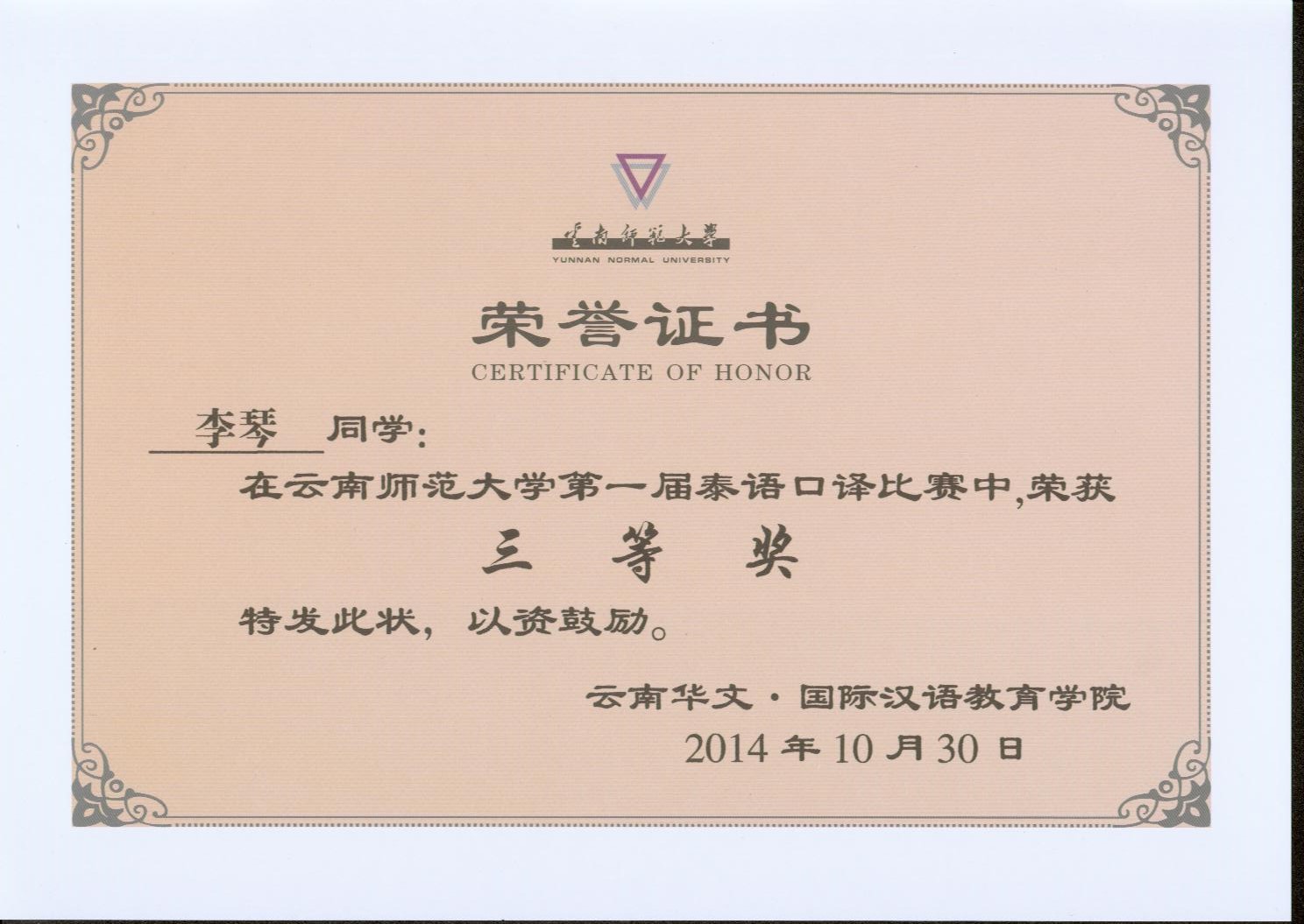 2014.10云南师范大学泰语口译大赛荣誉证书