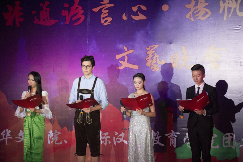 晚会由我院中外学生李艾伦、海涛、张美贞、谢淑茜四位共同主持。晚会始,《东南亚的月中国的圆》融合了东南亚文化和中国的本土文化,一支中国传统舞蹈,彰显了中国博大精深的传统文化。而后的东南亚的传统服饰的展示,让观众领略了东南亚独特的传统文化。当我们还停留在东南亚风情里不肯出来时,《Hola jazz》将我们领入现代舞的动感中,带动了全场的热情。一支《舞公主》又将观众带进幻虚幻实的境界中,接下来的《B-box》则让观众释放热情,用手中的麦克风使现场氛围跌宕起伏,配女声版的《月亮代表我的心》,又为其增添了一份神秘的色彩,紧接着我们欣赏了《斯里兰卡传统舞蹈》。